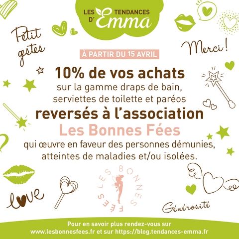 Collaborer et s’engager avec le monde associatif est depuis toujours une évidence pour Les Tendances d’Emma. Nous avons choisi de travailler depuis nos débuts avec un ESAT dans une démarche de réinsertion. Nous sommes fières d’avoir contribué à notre niveau à soutenir diverses actions solidaires comme Les Restau du Coeur Bébé, La Team Reine des Neiges, l’Association L’Espoir dans les Voiles… Notre engagement sincère envers chacun de ces projets associatifs nous pousse à croire en un monde meilleur. C’est notre #petitgeste pour de nouveaux sourires ! Et c’est un énorme honneur pour toute l’équipe de se mobiliser aux côtés de ces Bonnes Fées pour aider les femmes dans le besoin…