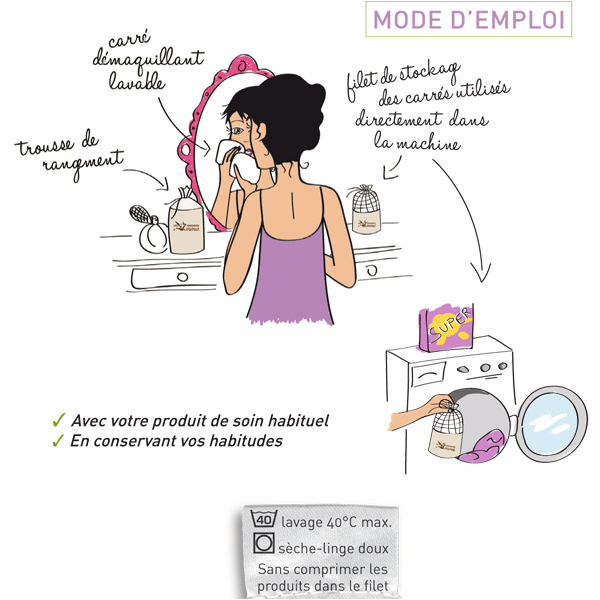 Ce kit permet de remplacer en toute simplicité vos carrés démaquillants lavables, tout en restant glamour : La petite trousse pour les stocker ainsi que le filet de lavage sont assorties et sont réalisées en coton bio.