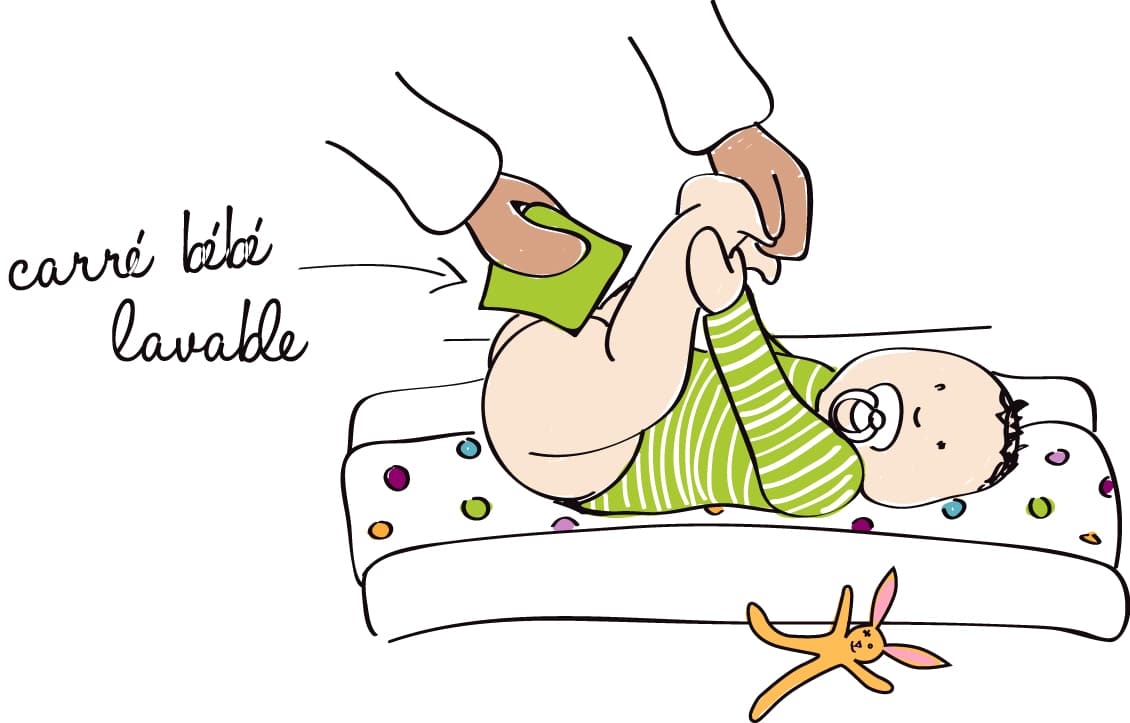– Le carré bébé : A utiliser en cas de pipi, il remplace votre coton ou lingette lors du change de bébé. Super simple, on lave et on réutilise… fini le coton !
